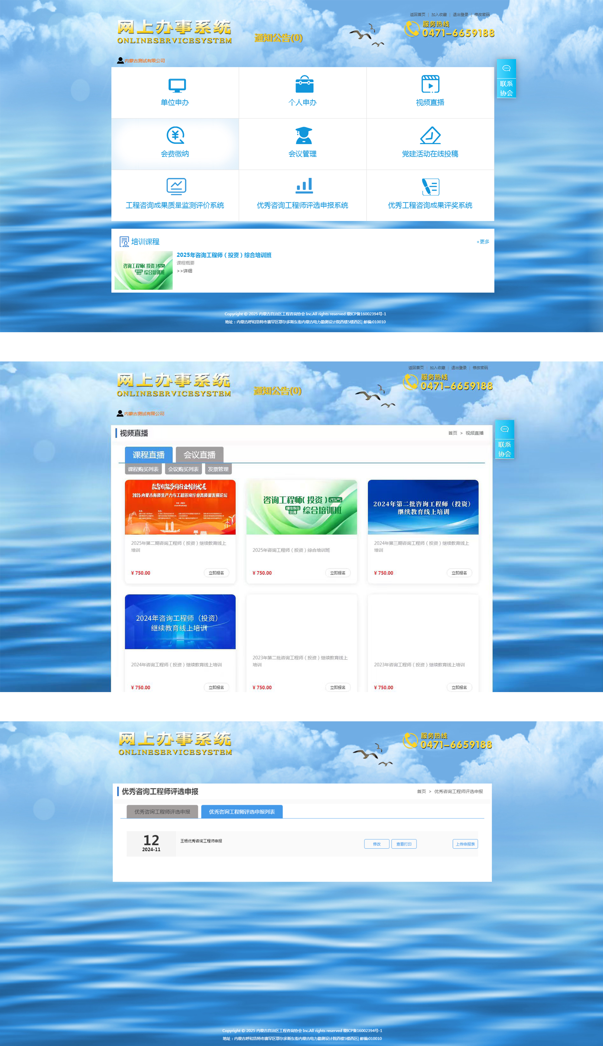 內(nèi)蒙古工程咨詢協(xié)會網(wǎng)上辦事系統(tǒng)功能豐富,涵蓋多類業(yè)務(wù)與服務(wù)。申報領(lǐng)域,支持單位、個人事項申辦,以及優(yōu)秀咨詢工程師評選申報、優(yōu)秀工程咨詢成果評獎申報;管理與直播方面,可進(jìn)行會議管理,也提供視頻直播服務(wù);費用繳納上,能在線完成會費繳納;投稿與監(jiān)測板塊,設(shè)有黨建活動在線投稿渠道,還有工程咨詢成果質(zhì)量監(jiān)測評價系統(tǒng)保障成果質(zhì)量;此外,還提供培訓(xùn)課程服務(wù)